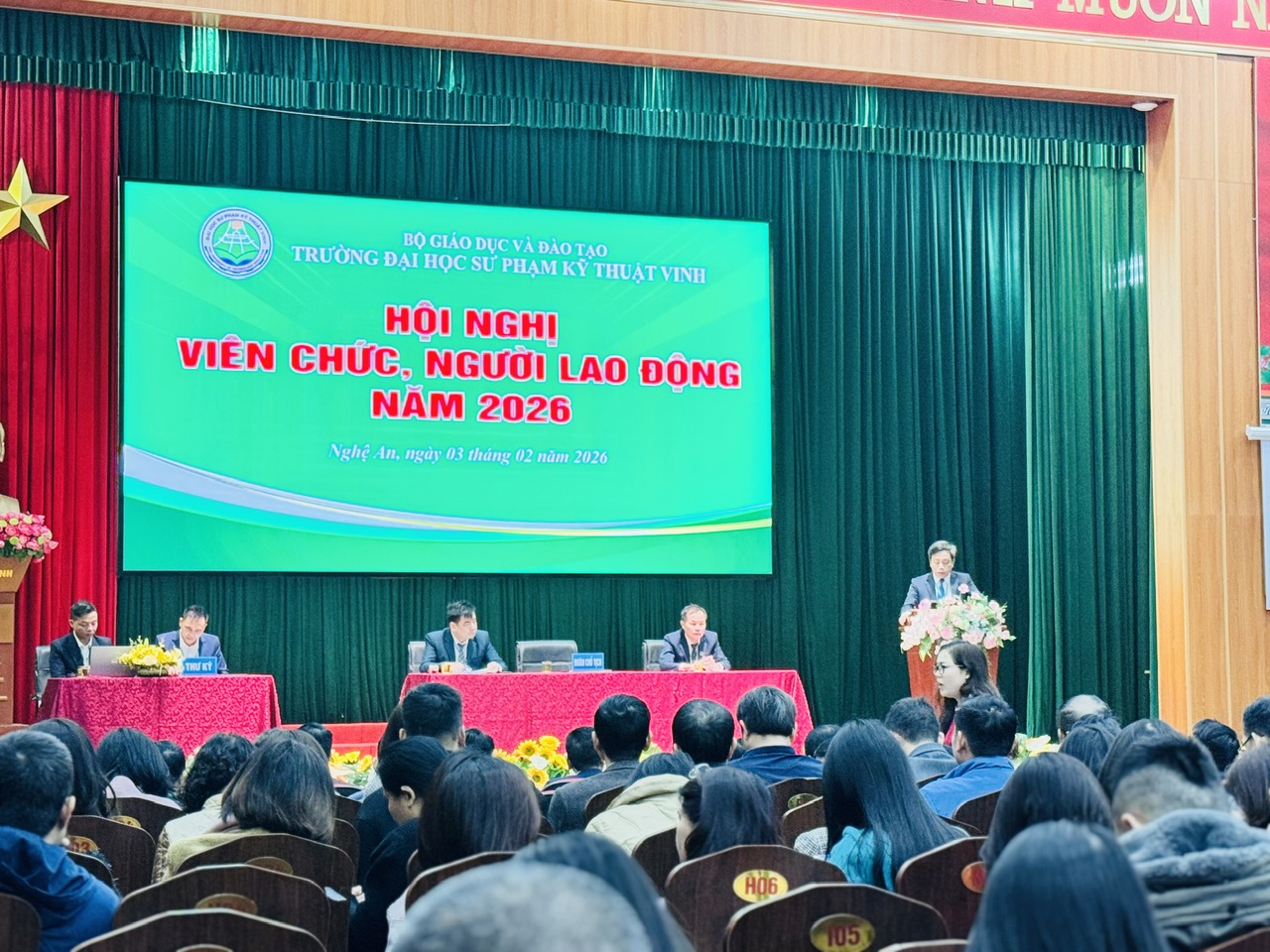 Sáng ngày 03/02/2026, Trường Đại học Sư phạm Kỹ thuật Vinh đã tổ chức Hội nghị Viên chức, Người lao động năm 2026 theo đúng kế hoạch. Hội nghị là diễn đàn quan trọng phát huy dân chủ cơ sở, tổng kết một năm nỗ lực và thống nhất quyết tâm hành động ...